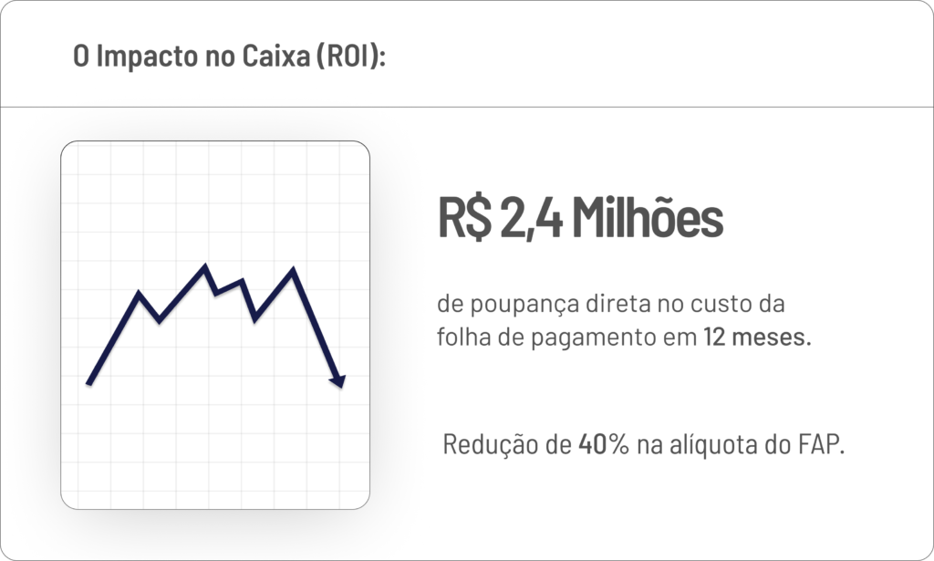 Implementámos uma auditoria médica e jurídica rigorosa para sanear o histórico de afastamentos. Cruzámos dados de saúde com a folha de pagamento para identificar cobranças indevidas da Previdência Social.