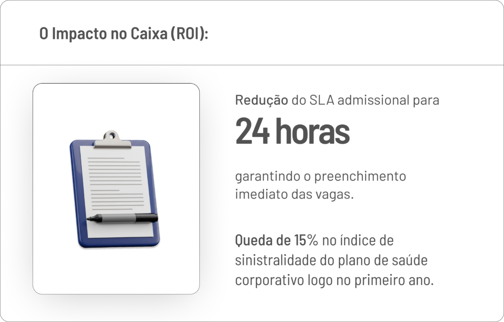Alto tempo de paragem na contratação (lead time admissional superior a 5 dias) e um índice de sinistralidade no plano de saúde privado a crescer 20% ao ano devido ao uso indevido de urgências pelos colaboradores.